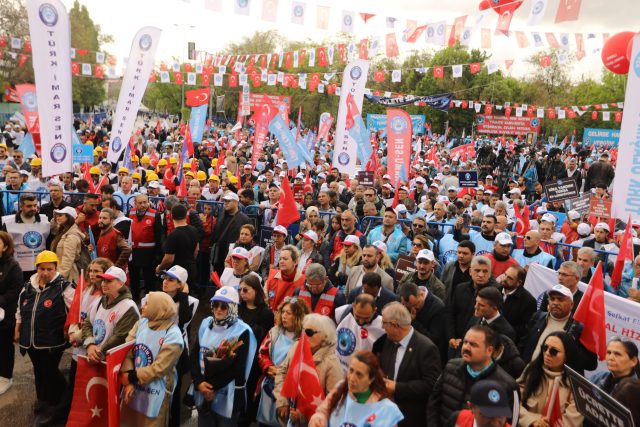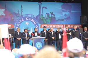 “Sendikal mücadelemiz kararlılıkla sürecek” diyen Genel Başkan Kahveci, “Önce vatan, önce emek” vurgusunu yaparken, “Bugün memurun sesi Türkiye Kamu-Sen’dir. Pes etmeyeceğiz, yılmayacağız, başaracağız! Toplu sözleşme hezimetlerini, adam kayırmayı, mülakatı desteklemek bizim fıtratımızda yok. Haksızlıklara boyun eğmek, haksızlığı, hukuksuzluğu savunmak, memurun da emeklinin de fıtratında yok. Bugün; gücün arkasına saklananların memuru hiçe saydığı, yürekli olanlarınsa “Artık yeter” diye haykırdığı gündür. Bugün; vicdan mahkemelerinin sesinin yankılandığı gündür. Bugün; memurlarımızın hak için bütün engelleri aştığı gündür. Bugün, tüm haksızlıklara karşı meydan okuyan bir Türkiye Kamu-Sen var. Bizlere düşen, haksızlıklar karşısında asla pes etmemek, asla susmamaktır. Çünkü, kamu çalışanlarının Türkiye Kamu-Sen’in gür sesine ihtiyacı var. Şu meydandaki coşkuyu ve birlikteliği gördüğümde, birlikten doğan gücümüzü, iliklerime kadar hissediyorum. Türk milleti olarak öyle güçlüyüz ki, hiçbir bıçak kesemez bizi, hiçbir ateş yakamaz, hiçbir dalga boğamaz… Milletimizin, Mustafa Kemal Atatürk önderliğinde, bir asır önce başlattığı bağımsızlık yürüyüşünü hiçbir güç durduramaz.