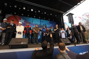 Saygı duruşu ve hep bir ağızdan coşkuyla okunan İstiklal Marşımızın ardından sendikalarımızın Genel Başkanları peş peşe sahneye çıkarak katılımcıları selamladı.