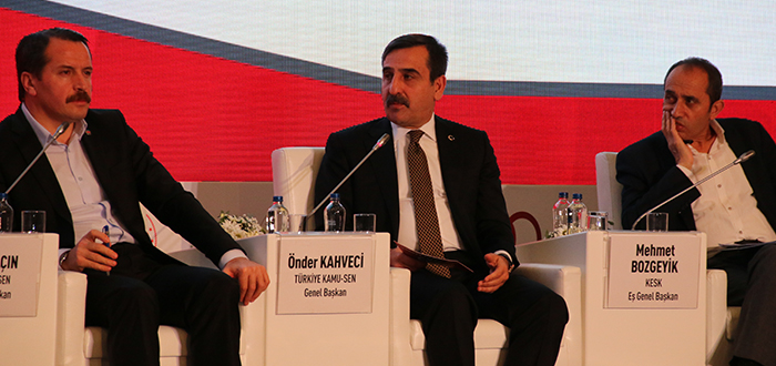 “Türkiye’de Sosyal Diyaloğun Geleceğini Birlikte Şekillendirmek” konulu oturuma panelist olarak Katılan Genel Başkanımız Önder Kahveci, projeye emek veren herkese teşekkür ederek başladığı konuşmasında, çalışma hayatı ve geleceğe ilişkin değerlendirmelerde bulundu. Kahveci, “Sosyal diyalog projesinde emeği geçenlere teşekkür ediyor, ILO’nun 100. Kuruluş yıl dönümünü kutluyorum. Sendikal örgütlenme konusunda yüzdelik oranlara bakıldığında kamuda yüzde 67 oranında bir örgütlenme var. Bu oran işçilerde daha düşük. Ancak örgütlenmenin önünde ciddi sorunlar var. Kamuda işçi kesimine göre biraz daha ağır sorunlar var. Örgütlenmede güç odaklarının etkisi çok fazla. Bir kere, sendikalar arasındaki ayrım ortadan kaldırılmalı. Çalışanlar kendi aralarında rekabet yaşayabilir ama yöneticiler bu rekabetin içine girerse bu olmaz. Kamuda sendika yöneticilerimizin görev yerleri değiştirilerek baskılar kuruluyor. Eşit şartlarda mücadele gereklidir ve bu konuda adımlar atılmalı.