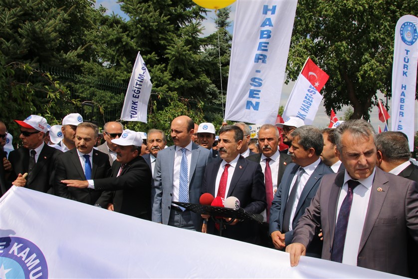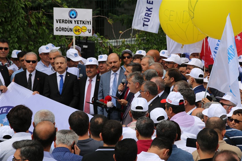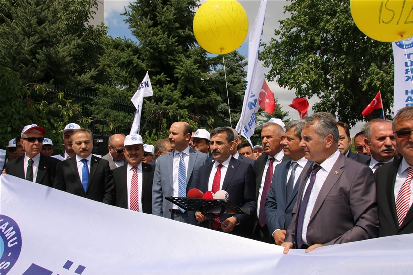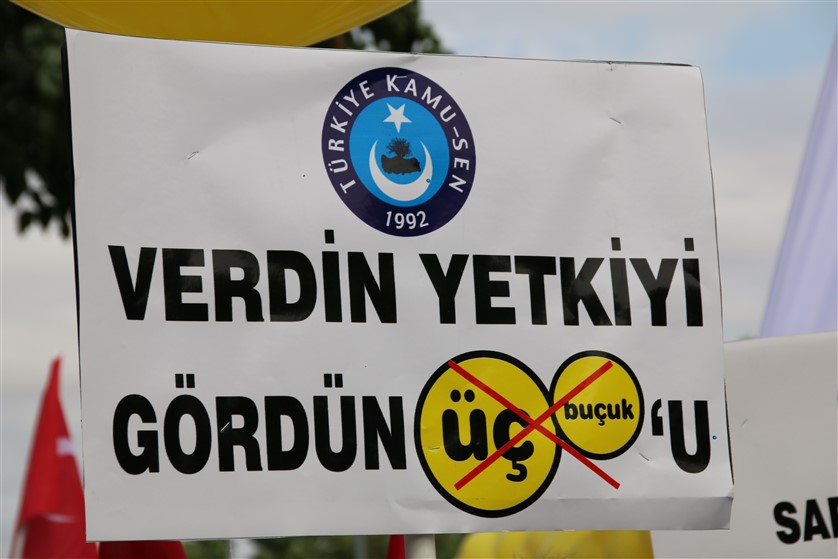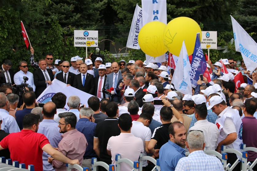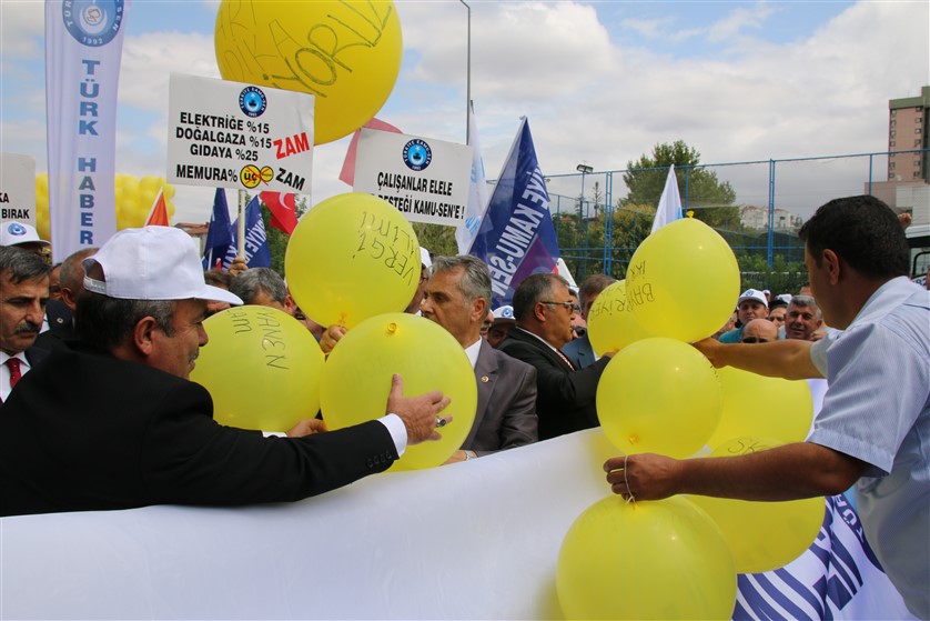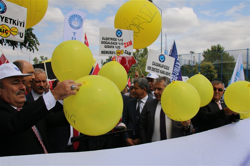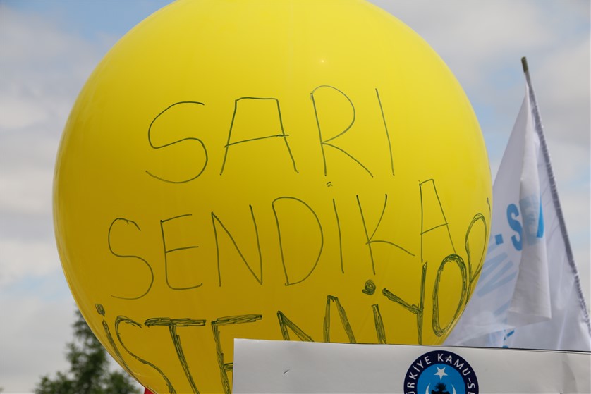 Katılımcıların attığı “Sarı sendika istemiyoruz” sloganları ile inleyen Çalışma Bakanlığı binası önünde hazırlanan sarı balonlar da patlatılarak, yetkili konfederasyona “Masada memuru pazarlamayın” uyarısında bulunuldu.