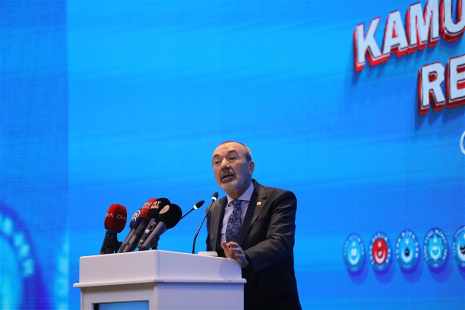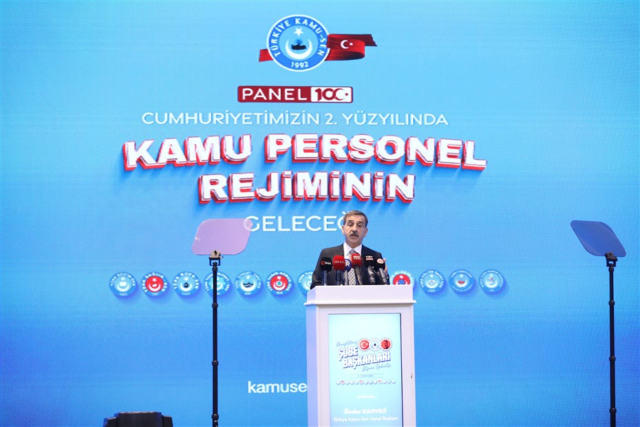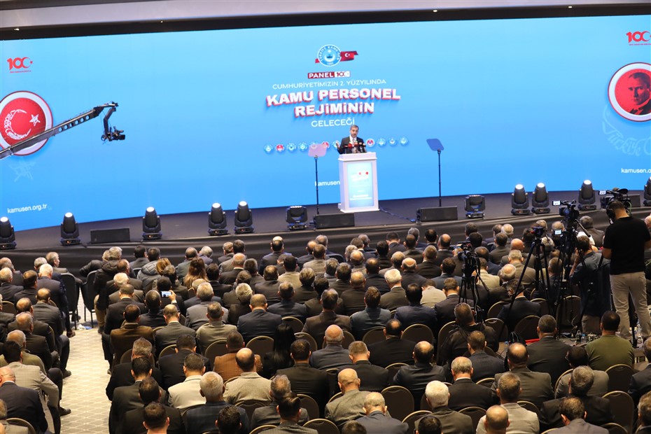“Cumhuriyetimizin 100. Yaşını kutlamanın coşkusunu yaşadığımız bu günlerde, ikinci asrımız için büyük umutlarla doluyuz. Her alanda güçlü bir ülke idealinde, Türk ve Türkiye Yüzyılı hedefi, devletimizin görünen yüzü olan kamu çalışanlarının omuzlarında yükselecektir. Değişen zamana ve gelişen devlet ve kamu hizmeti anlayışına paralel olarak yeni bir kamu personel rejimine ihtiyaç duyulduğu açıktır. Türkiye Kamu-Sen olarak üstlendiğimiz çalışan, üreten ve yol gösteren sendikacılık misyonumuza uygun bir şekilde yine bir ilki gerçekleştiriyoruz.