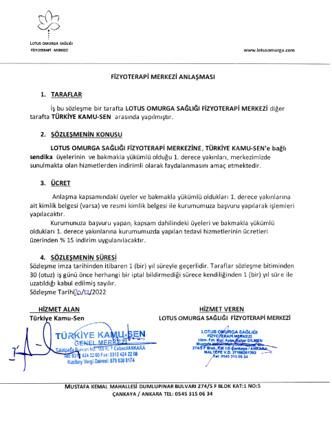 Türkiye Kamu-Sen ve Lotus Fizyoterapi Merkezi arasında üyelerimize özel bir anlaşma imzalandı.