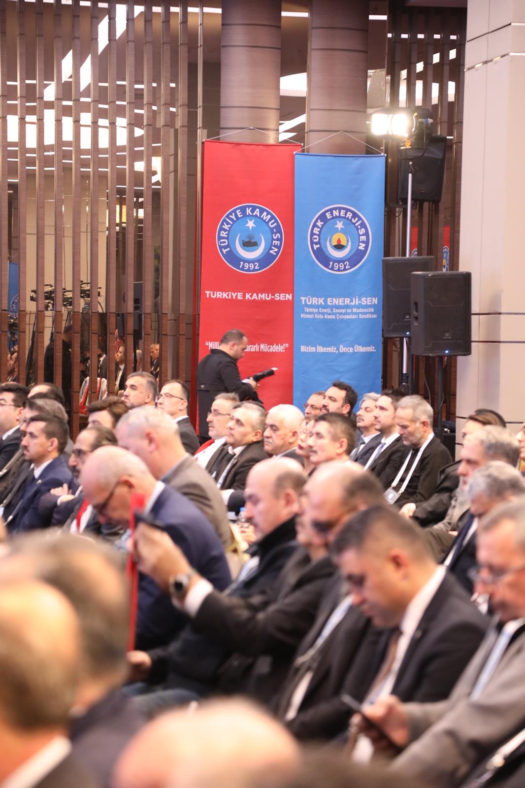 Genel Başkanımız Kahveci, Türk Enerji-Sen’in kurulduğu günden bu yana yalnızca üyelerinin değil, aynı zamanda üye olmayan çalışanların da hak ve hukukunu savunan bir sendikal anlayışla hareket ettiğini vurgulayarak, “Bu konuda mütevazı olmaya gerek yok. Türkiye’de memurlara sendikal hak verilmesi meselesini kamuoyunun gündemine taşıyan yapı Türkiye Kamu-Sen’dir. Bugün sendikacılık adına konuşan birçok yapı, Türkiye Kamu-Sen’in açtığı yolda yürümektedir. Ancak bu alanda rüştünü ispat etmiş olan tek gerçek Türkiye Kamu-Sen’dir. Buna tarih şahittir” dedi.