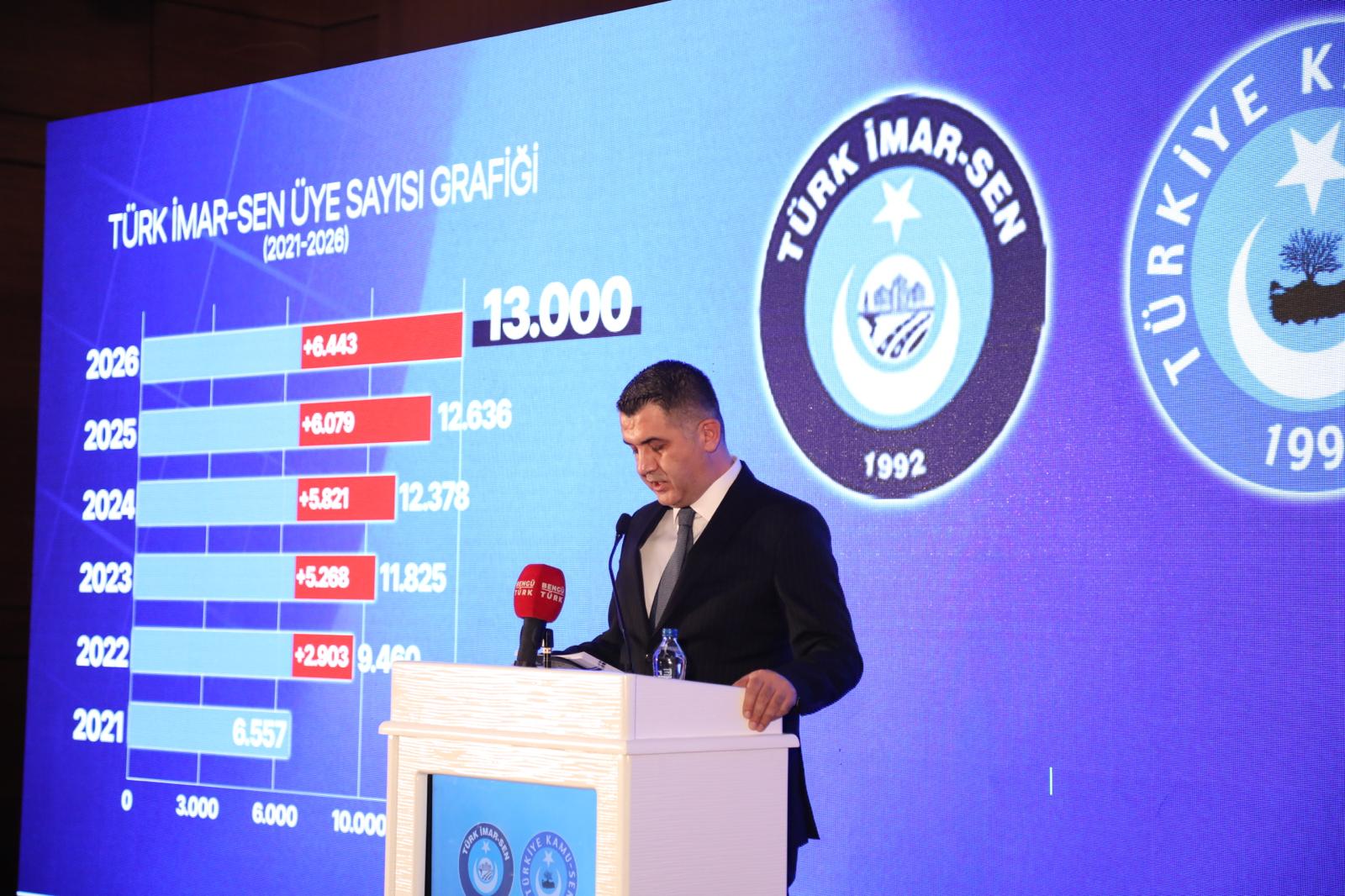 2021 yılı yetki döneminde 6.557 olan üye sayımızı 2025 yılı yetki dönemi sonunda 12.636, 2026 yılı ocak ayı itibariyle de 13.000 seviyesine çıkarmayı başardık. Bu başarı; bizimle birlikte olan bizlere güvenen, şube Başkanlarımız, Şube Yöneticilerimiz, il temsilcilerimiz, işyeri temsilcilerimiz ve burada bulunan siz kıymetli delegelerimizin başarısıdır! Bu başarı Türk İmar-Sen’in başarısıdır! Bu başarı Türkiye Kamu-Sen’in başarısıdır!