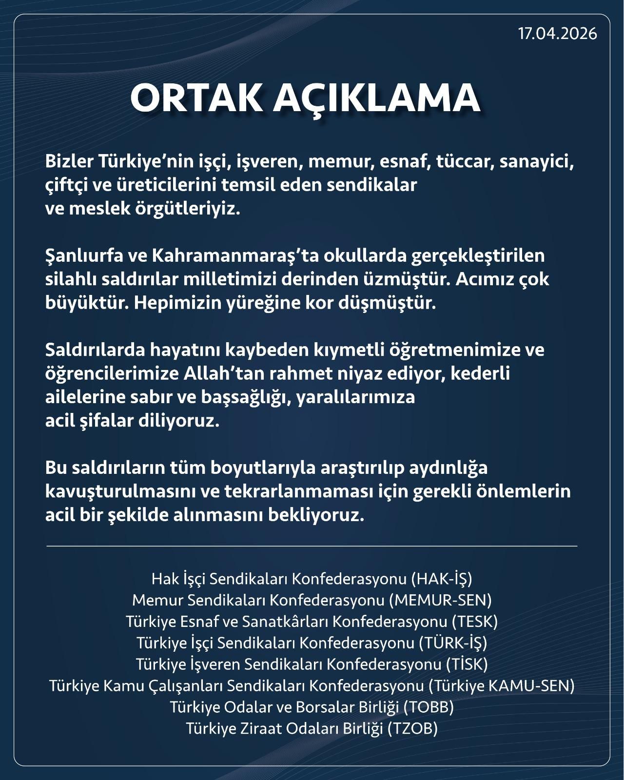 Şanlıurfa ve Kahramanmaraş’ta okullarda gerçekleştirilen silahlı saldırılar milletimizi derinden üzmüştür. Acımız çok büyüktür. Hepimizin yüreğine kor düşmüştür.