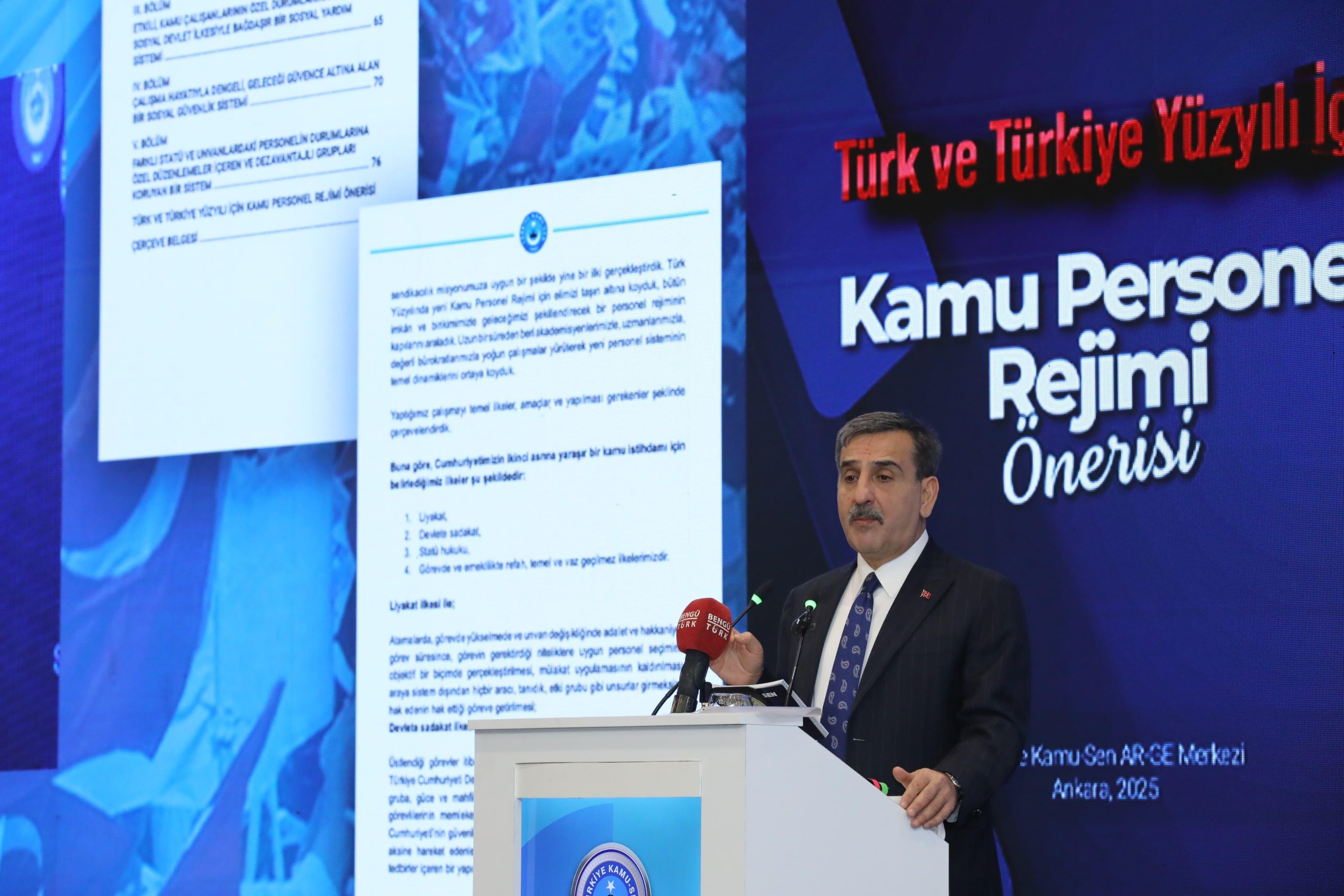 İkincisi, adil, sade ve kamu çalışanlarının insanca yaşamasına yetecek bir ücret sistemi; Üçüncüsü, çalışma hayatıyla dengeli, geleceği güvence altına alan bir sosyal güvenlik sistemi; Dördüncüsü ise ILO normlarına uygun, katılımcı ve kapsayıcı bir sendika ve toplu pazarlık sistemidir. Bu konudaki çalışmalarımızı büyük bir titizlik içinde uzman ekibimizle gerçekleştiriyor, önerilerimizi hazırlıyoruz. Bu ay içerisinde Ar-Ge Merkezimizin hazırladığı Kamu Personel Rejimi önerimizi kamuoyu ve ilgililerle paylaşacağız. Çok kısa bir süre içerisinde de diğer konulardaki çalışmalarımızı tamamlayıp ilgililere sunacağız.