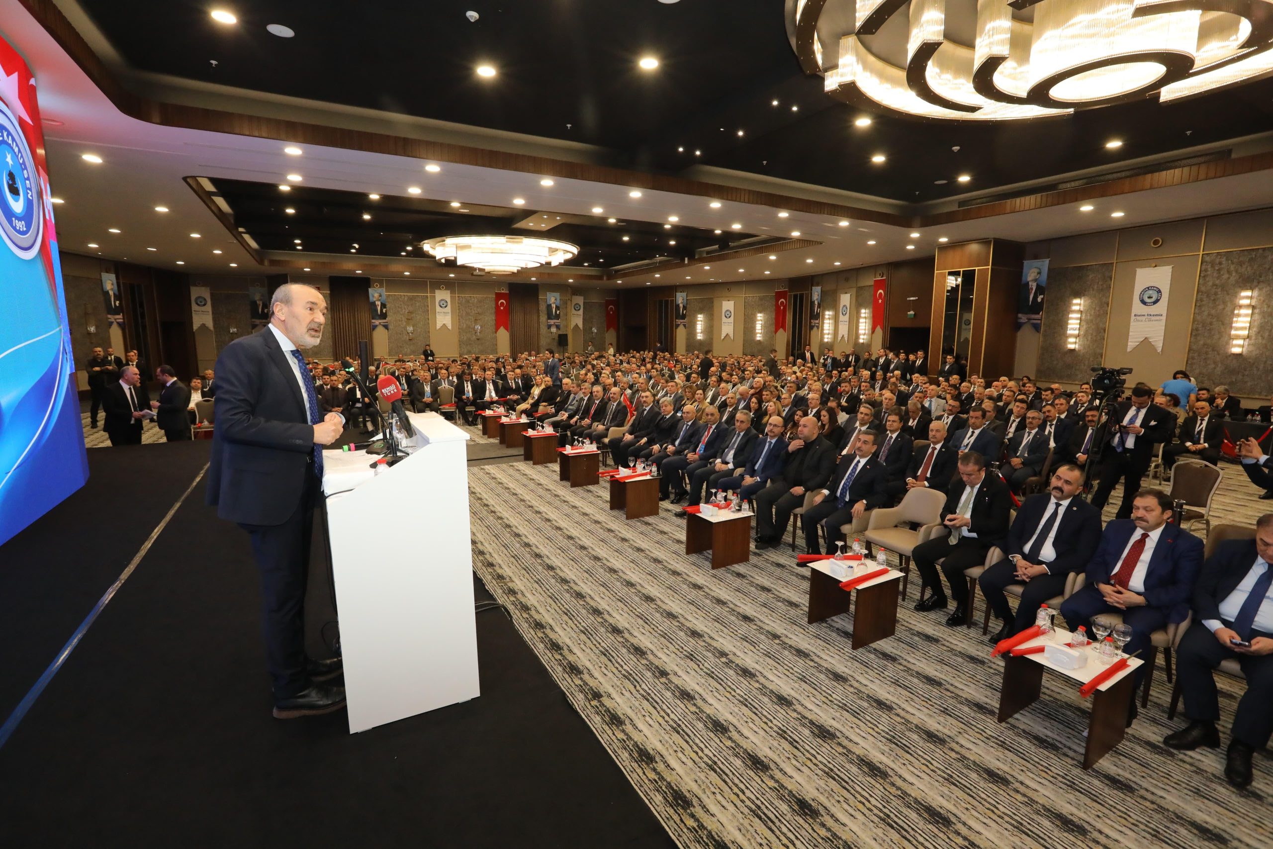 Protokol konuşmaları çerçevesinde Teşkilatlardan Sorumlu Genel Başkan Yardımcımız ve Türk Haber-Sen Genel Başkanı Yücel Kazancıoğlu, “Türkiye Kamu-Sen, yalnızca bir sendika değildir. Bizler, sıradan bir topluluk değiliz. Türkiye Kamu-Sen, Türk milletinin sinesinden doğmuş, onun öz değerleriyle yoğrulmuş, hak, adalet ve insan onurunu esas alan büyük bir davanın adıdır. Sizlerin de malumu dünya farklı coğrafyalarda yaşanan sarsıntılarla yeniden şekilleniyor. Gazze’den Doğu Türkistan’a Doğu Türkistan’dan sınırlarımıza kadar her bölgede yaşanan büyük çatışmalar insanlığı her geçen gün yeni mücadelelere gebe hale getiriyor. Bu çalkantının ortasında Türkiye’miz, ay yıldızlı sevdamız bir ışık gibi parlıyor. Bizim değer iklimimizde yetişen insanlar için yeni bir mevsimi müjdeliyor. Karabağ savaşı ile kor olan çocukluk heyecanımızın ateşi dünya Türklüğüne güven aşılamıştır. Bu sene düzenlenen Türk Devletler Teşkilatı toplantısında Gaspralı İsmail Bey’in “Dilde, fikirde, işte birlik.” mesajının tüm Türk yurtlarında benimsenmesi ile bu güven perçinlenmiş ve gönüllerimizde sönmeyen bir meşale olarak parlamıştır.