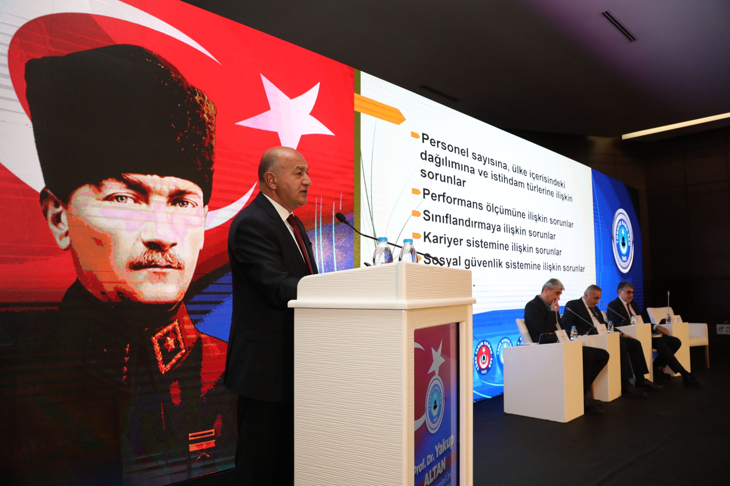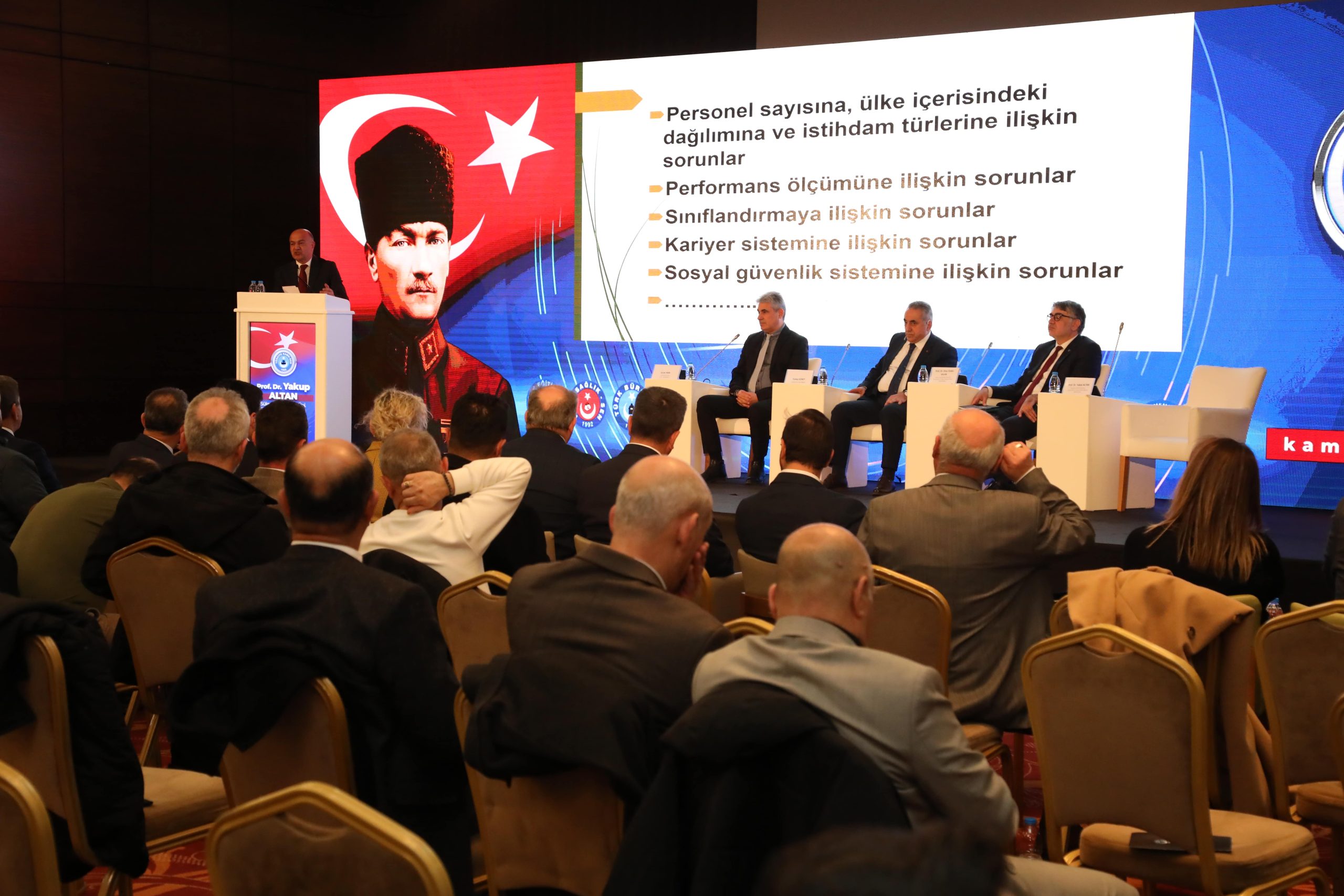 Genel Başkanımız Önder Kahveci konuşmasında, Kamu personel sisteminde liyakat eksikliği, mülakatla alım uygulamaları, yardımcı hizmetler sınıfı çalışanlarının mağduriyeti, sözleşmeli personelin kadroya geçirilmesi sürecindeki aksaklıklara da değinerek, Türkiye Kamu-Sen’in çalışma hayatında yaşanan tüm sorunların takipçisi olacağını yineledi.